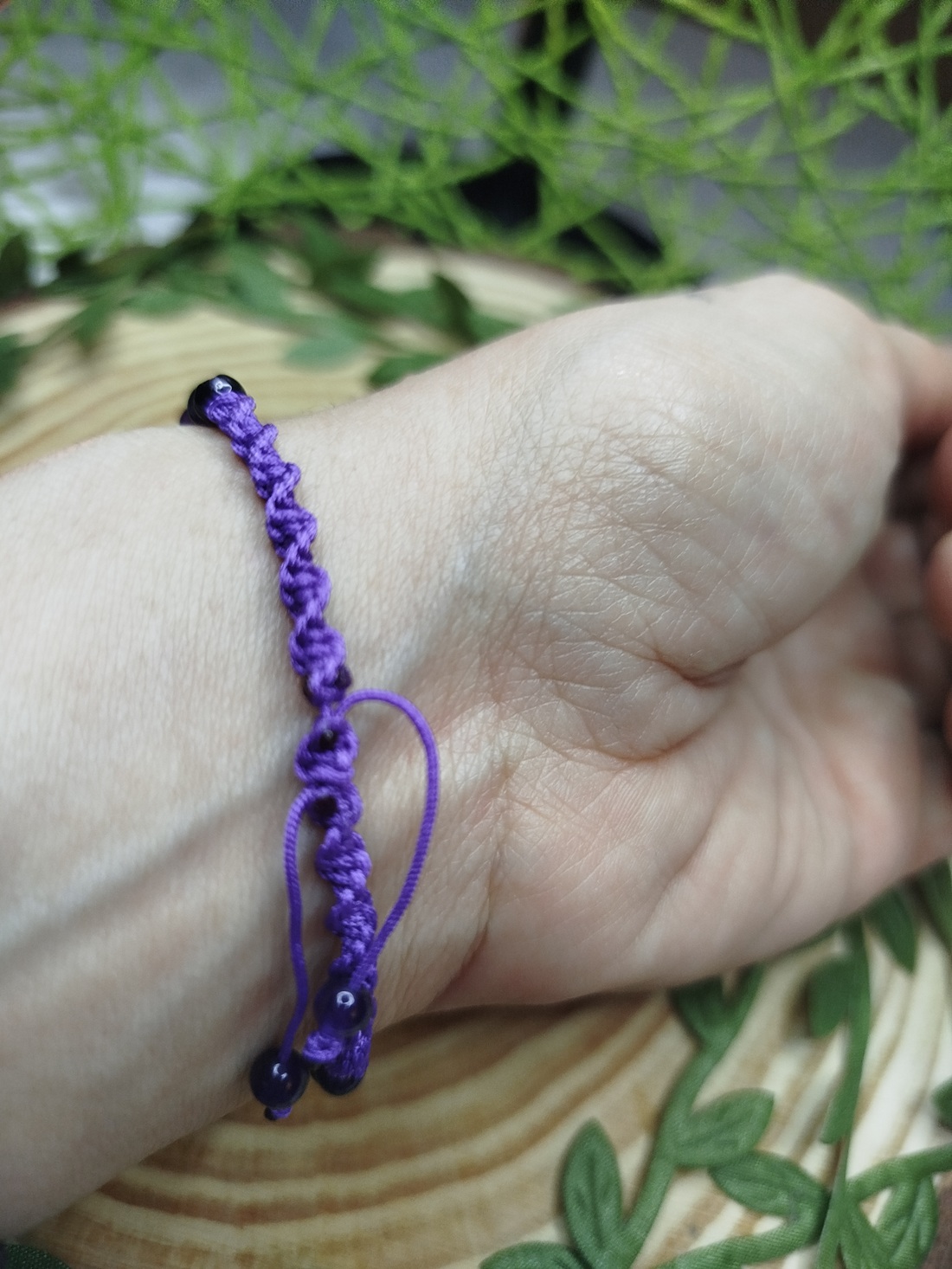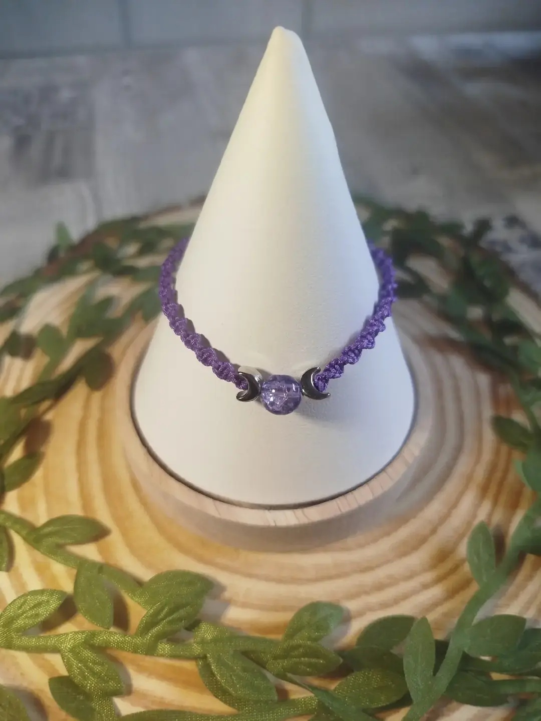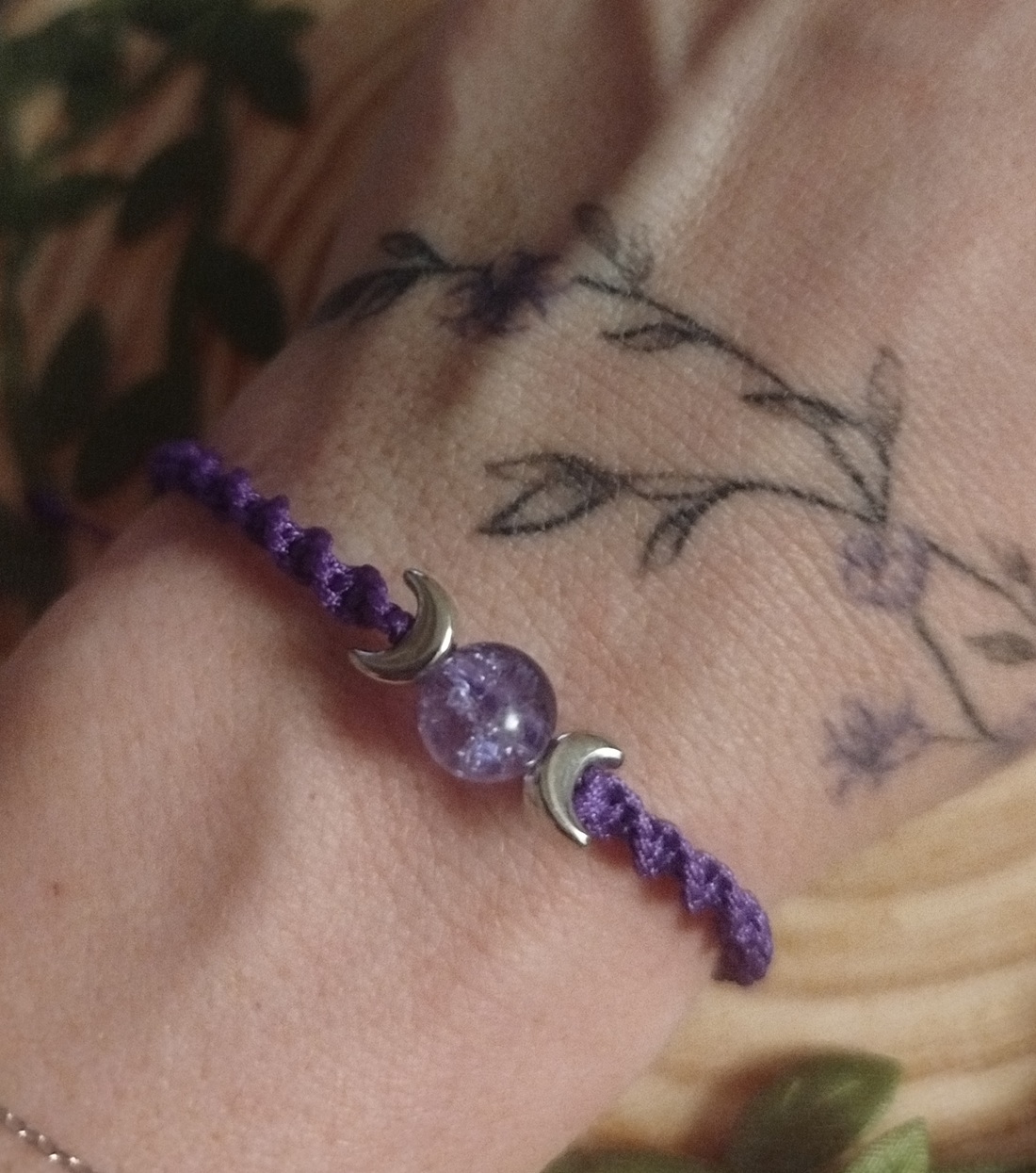 Pulsera en macramé redondo de color morado.,acompañado de la simbología de «La triple luna» símbolo que representa las tres fases lunares (creciente, llena y menguante) y